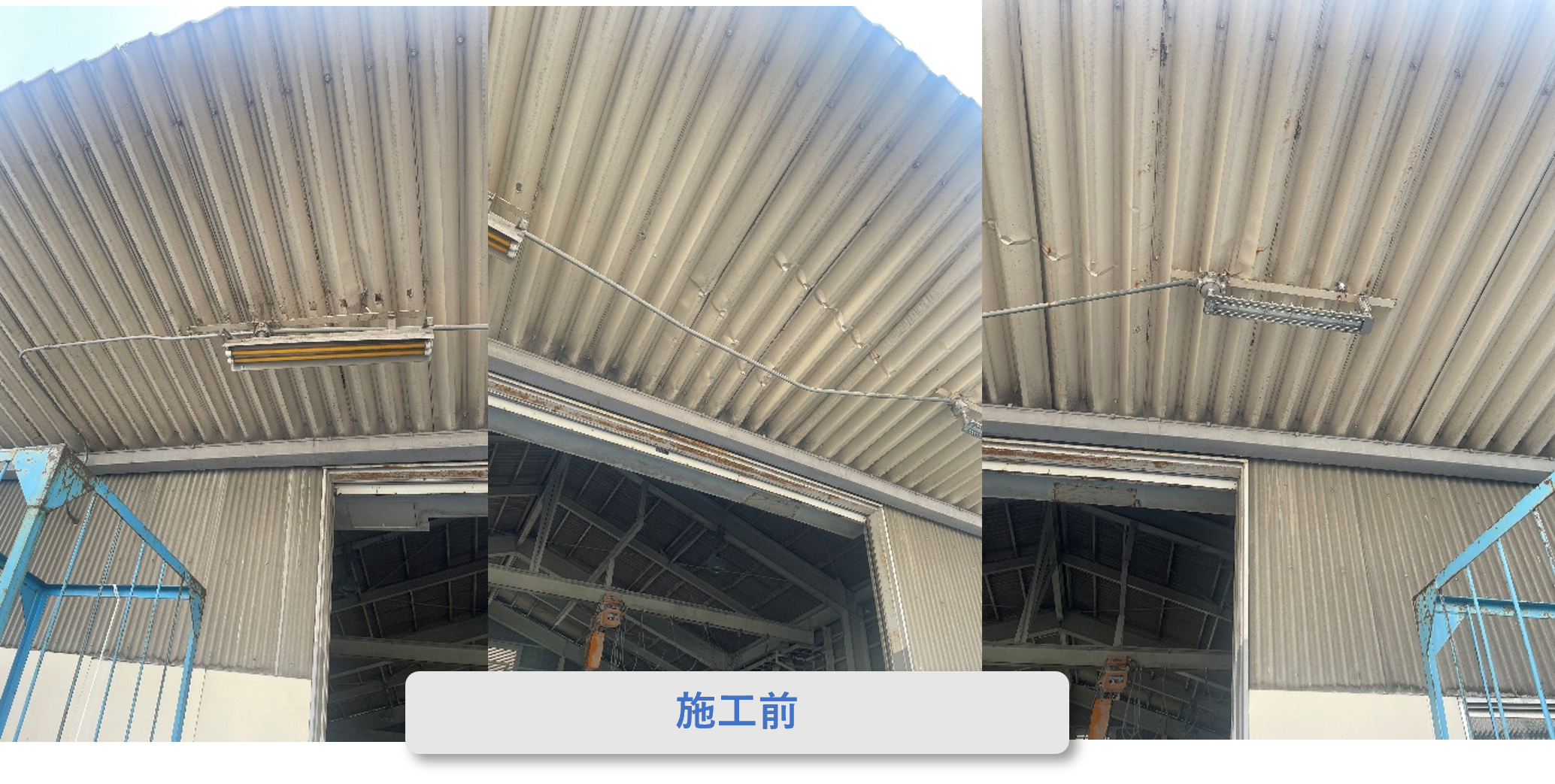 当事例では、お客様より「フォークリフトで荷を運搬中、荷を上げ過ぎたことにより、電線管を損傷させてしまった…」とご相談いただきました。 確認したところ、電線管に接続されていた照明器具の架台も破損しており、照明器具が落下しそうになっており、非常に危険な状態でした。