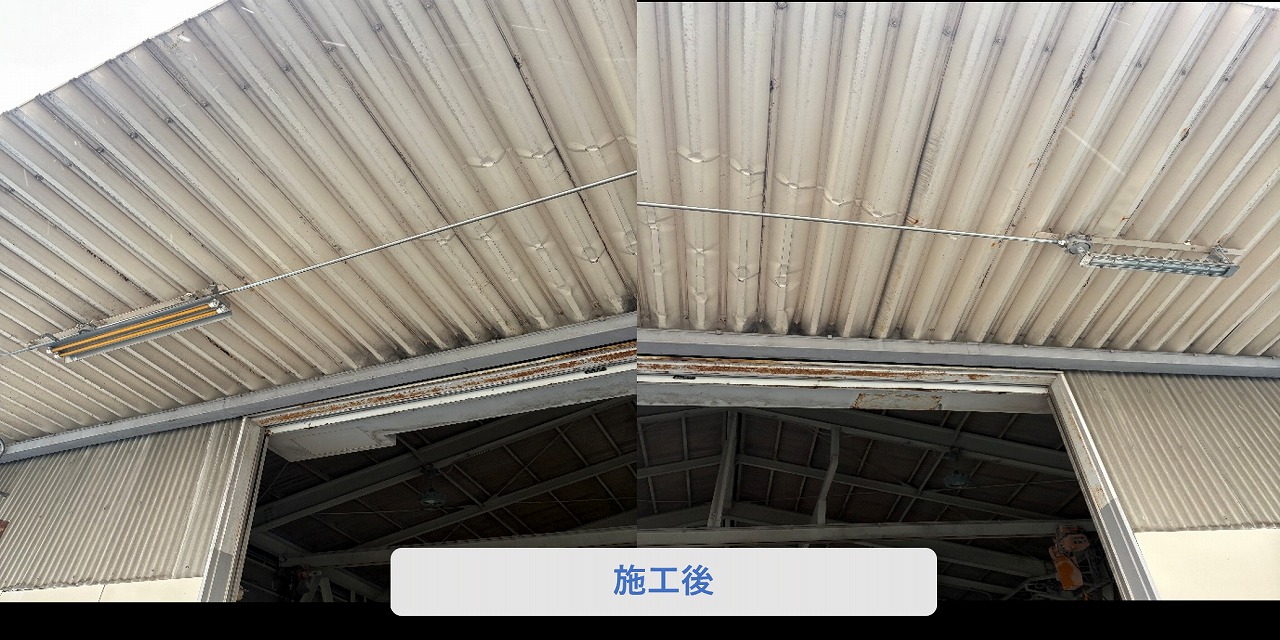 今回の修理作業は、屋根が鉄板でできていたため、屋根の上での作業や移動は比較的スムーズに行うことができました。しかし、作業中に確認したところ、屋根の所々に腐食が進んで弱くなっている箇所が数か所見受けられ、移動の際には細心の注意を払いました。