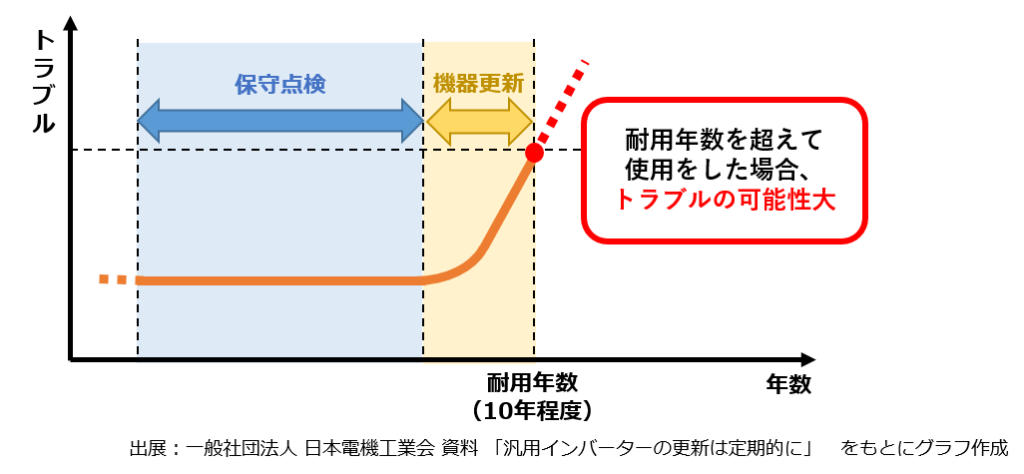 インバーターの耐用年数は一般的に10年程度とされており、長期間使用すると部品の劣化や制御性能の低下が進みます。定期的な点検や保守を行っていても、経年劣化による故障リスクを完全に避けることはできません。突発的にインバーターが停止すると、生産ライン全体が止まり、大きな損失につながります。